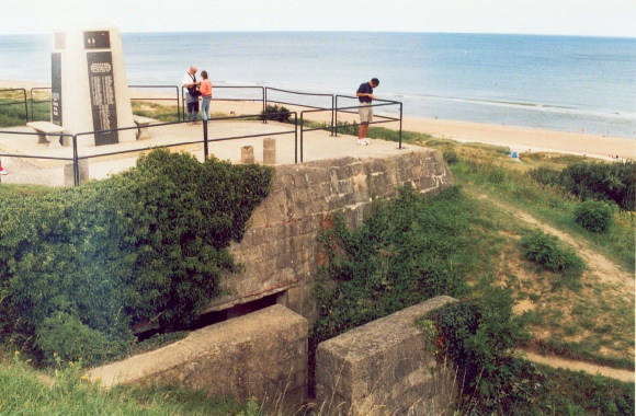 A memorial is erected on this German gun emplacement / bunker. Tiny black specks can be seen on the beach; the specks are people and provide some perspective of the commanding view and position of dominance the German occupation force had established on this French coast.
